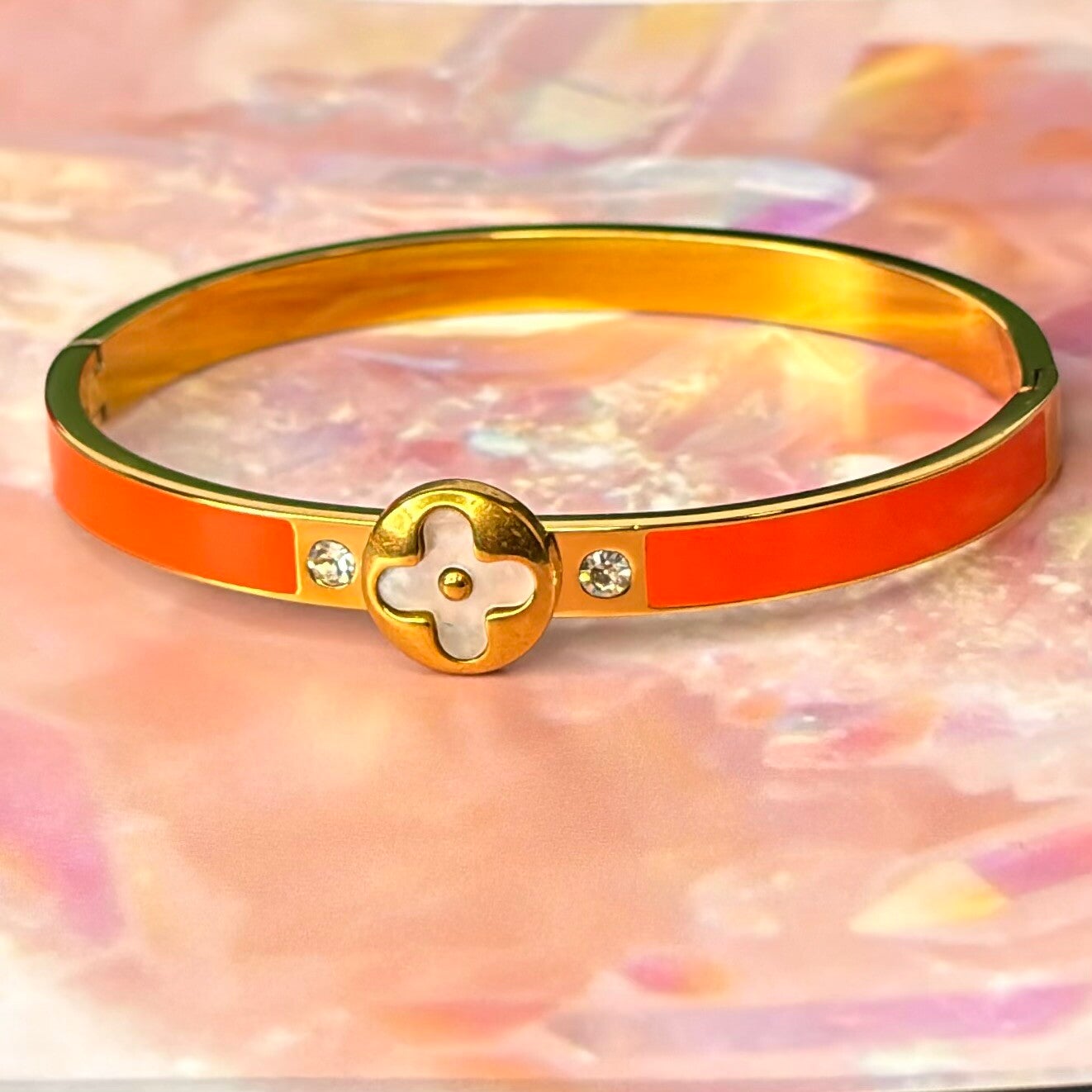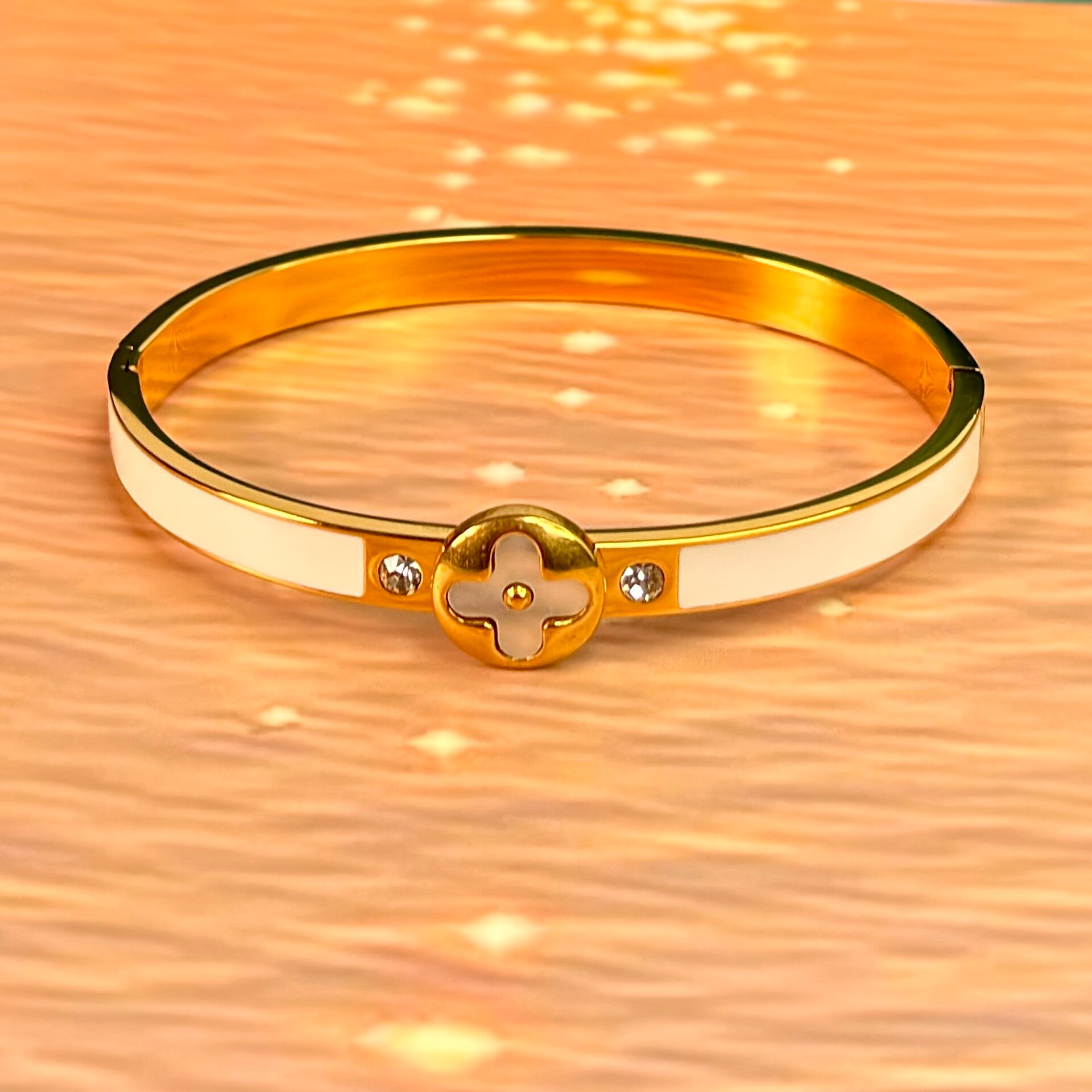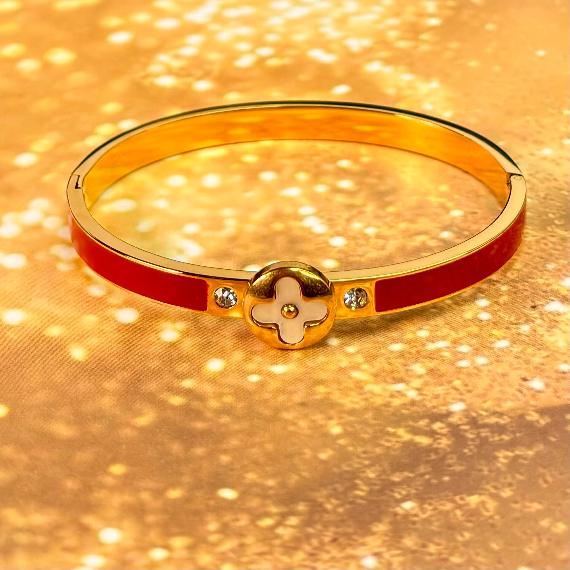 Make a vibrant statement with this striking stainless steel Tarnish-Resistant gold-tone bangle. Combining a rich color finish with a classic quatrefoil motif, this piece is designed for the woman who loves her accessories to have a bit of a "voice."