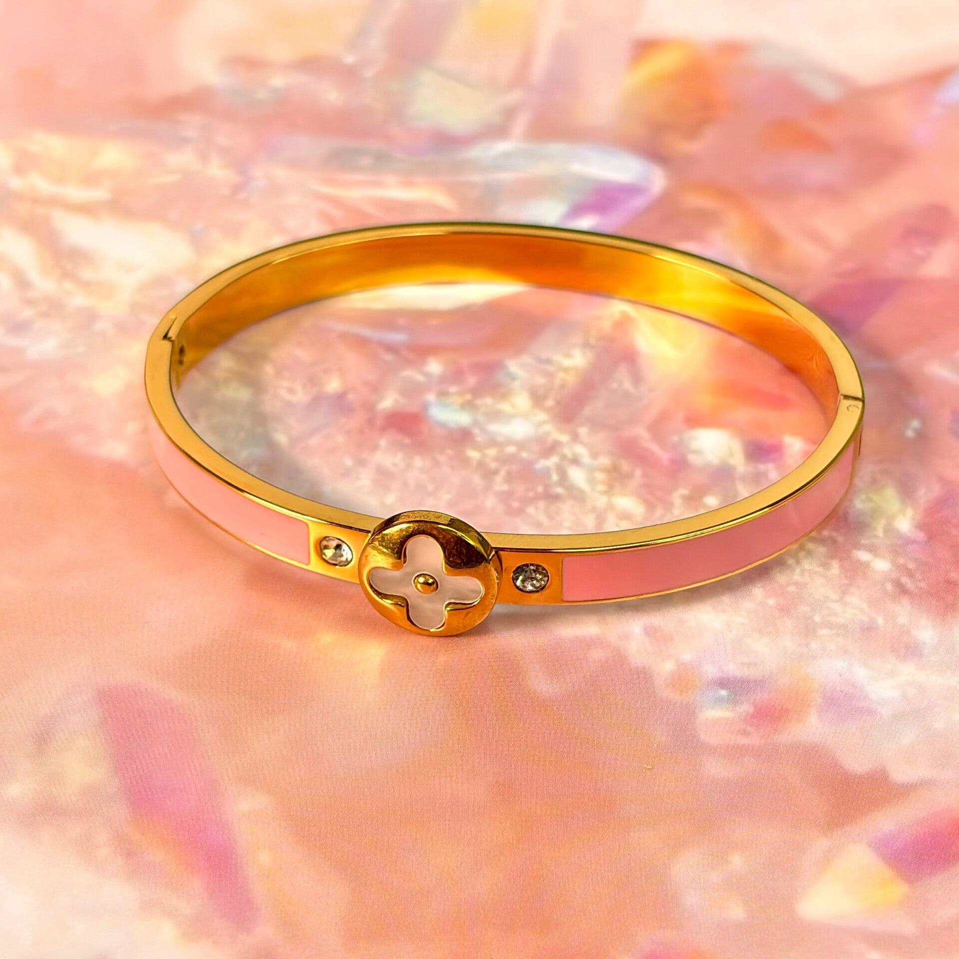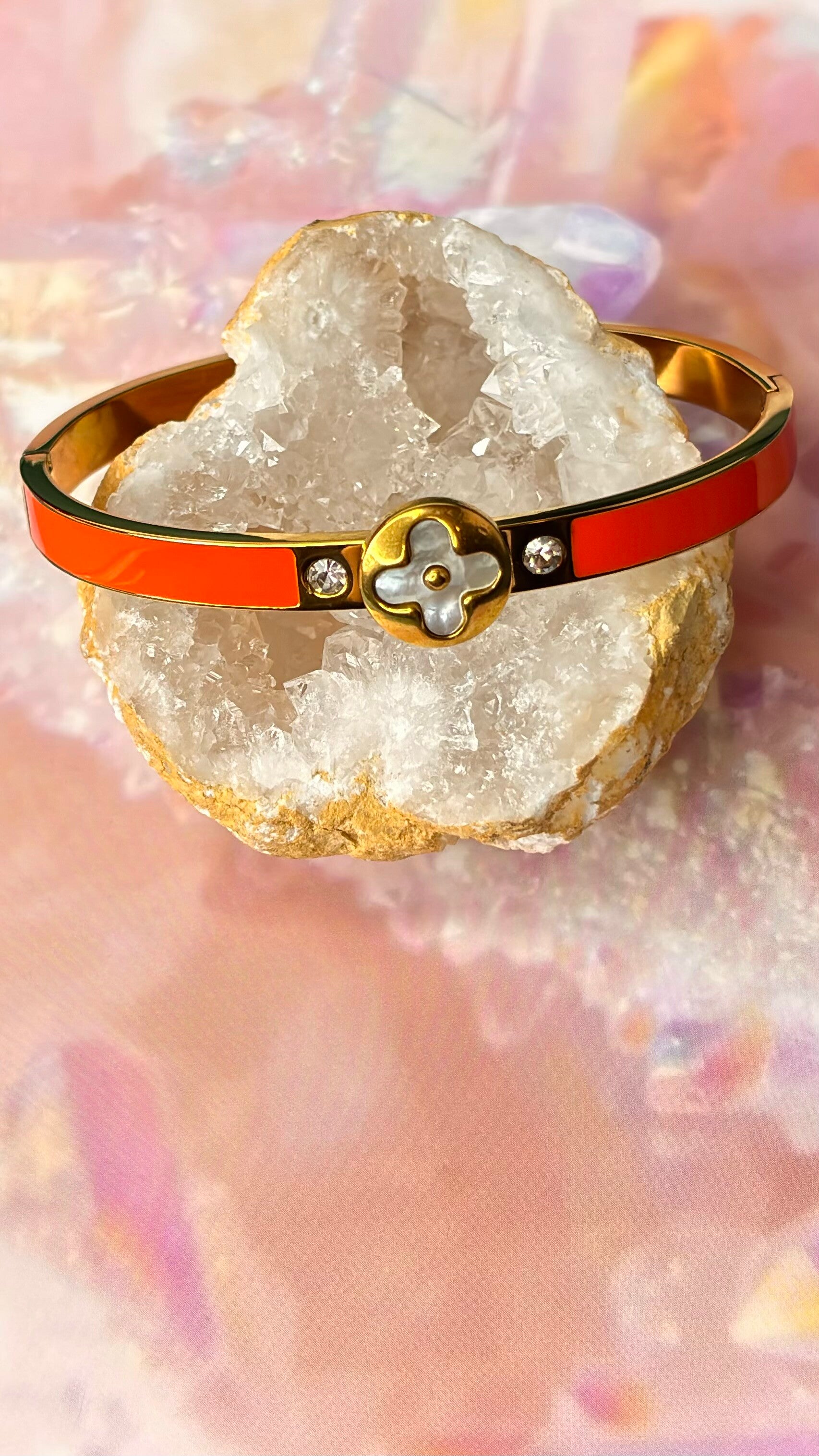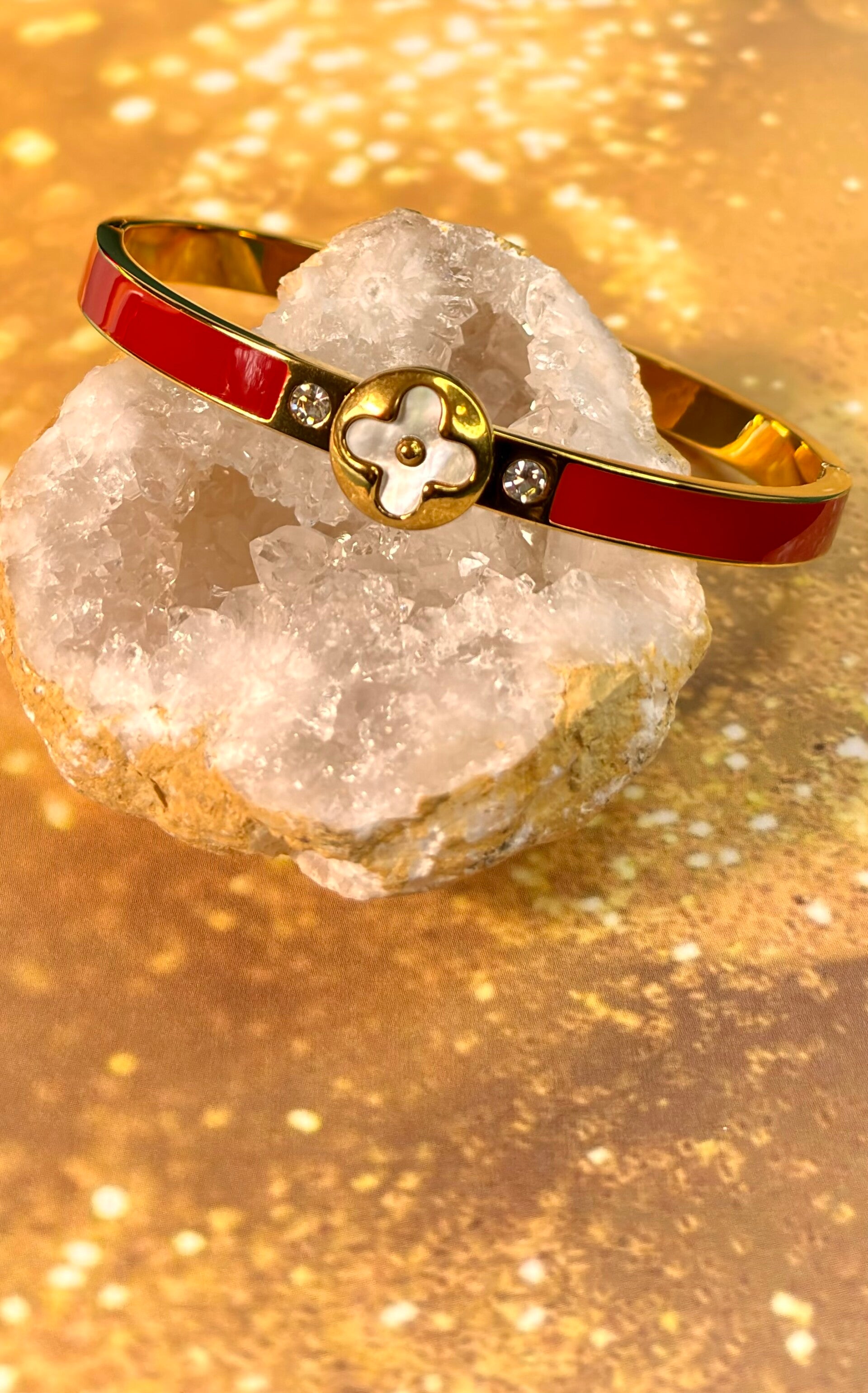 Make a vibrant statement with this striking stainless steel Tarnish-Resistant gold-tone bangle. Combining a rich color finish with a classic quatrefoil motif, this piece is designed for the woman who loves her accessories to have a bit of a "voice."