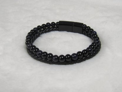 Bold and sophisticated, this bracelet features natural stones set in titanium steel with a rich leather band. A statement of strength and style.