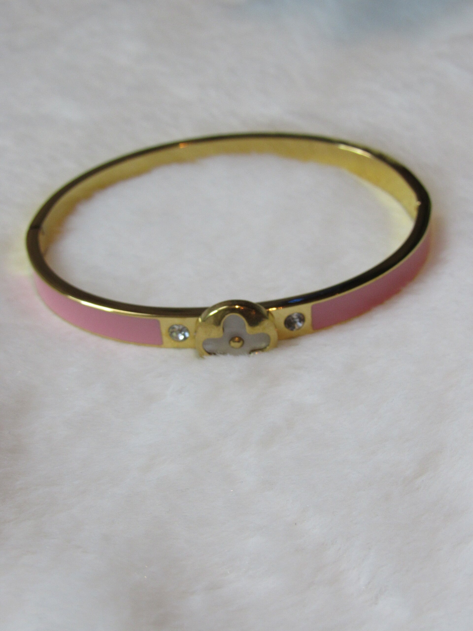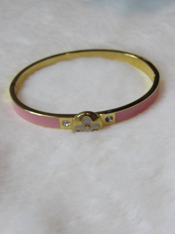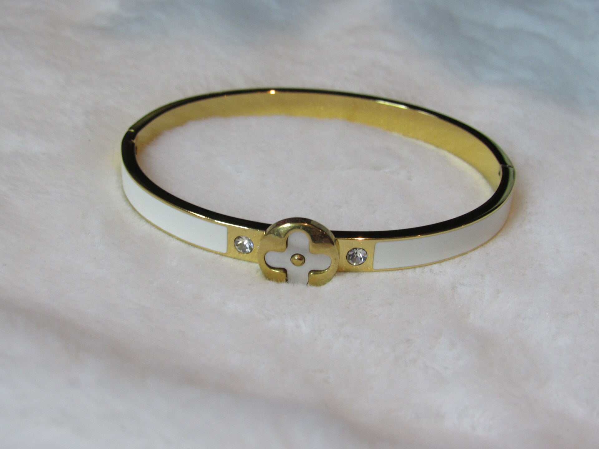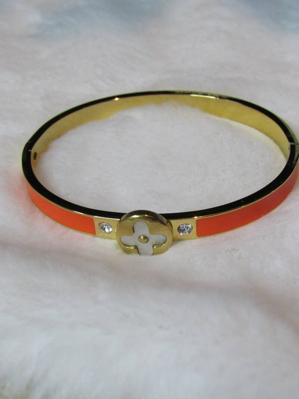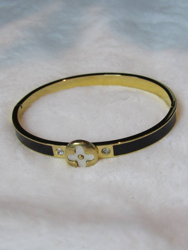 Make a vibrant statement with this striking stainless steel Tarnish-Resistant gold-tone bangle. Combining a rich color finish with a classic quatrefoil motif, this piece is designed for the woman who loves her accessories to have a bit of a "voice."