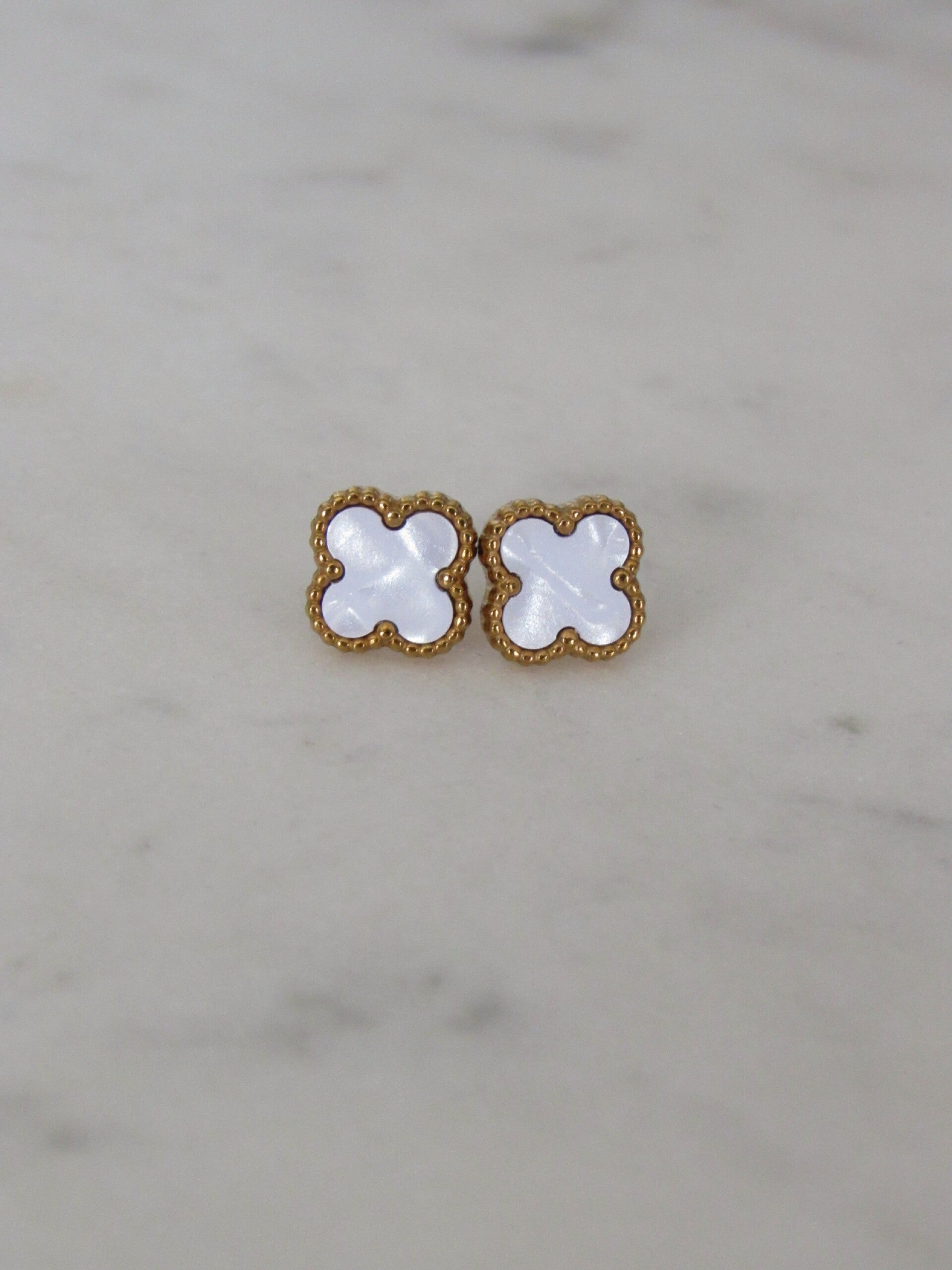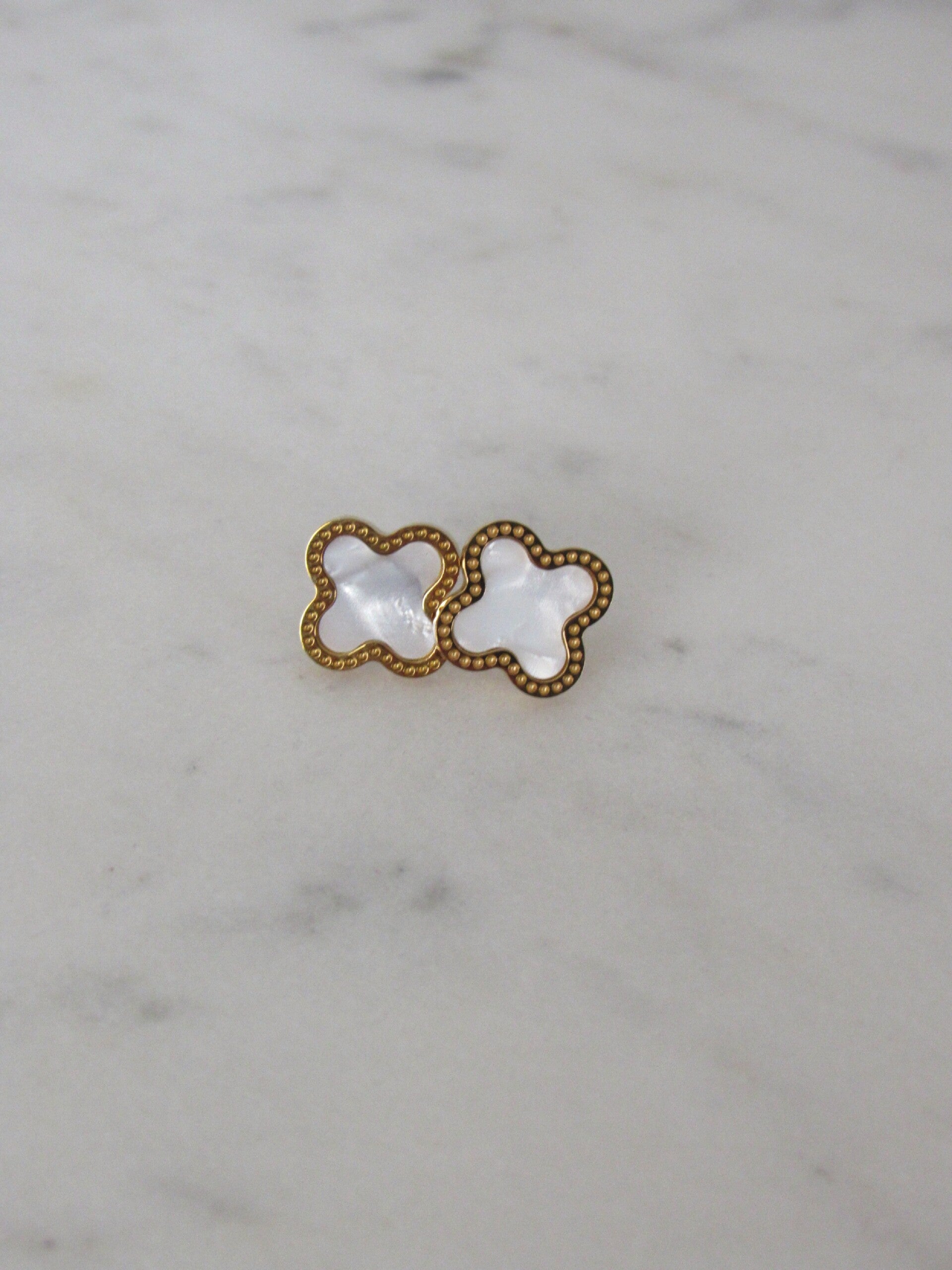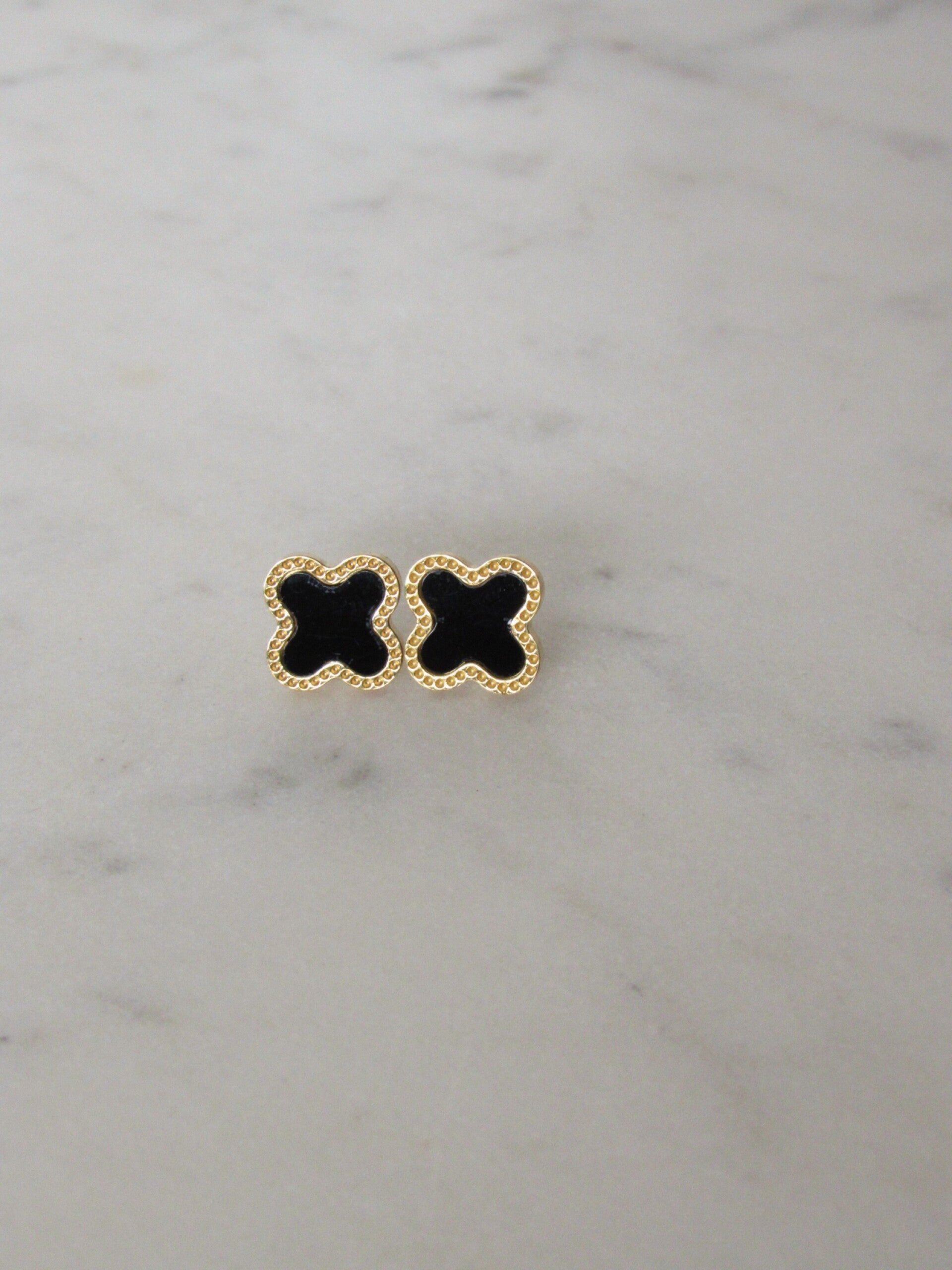 Elevate your everyday look with these sophisticated clover studs. Featuring a striking contrast between deep black inlays and a textured gold-toned border, these earrings offer a designer-inspired aesthetic that never goes out of style. Tarnish-Resistant.